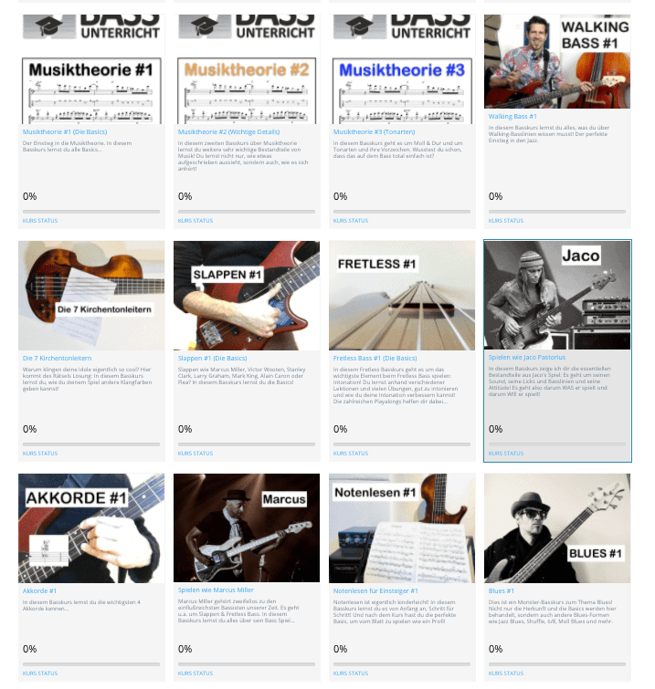 Die Anmeldung bei Florians Bassunterricht funktioniert über ein monatliches, halb-jährliches oder jährliches Abo. Wenn du dich für diesen Anbieter entscheidest, hast du immer gleich Zugang zu allen Kursen mit insgesamt 300 Videos. Leider ist die Seite nicht ganz transparent, was die Gesamtlaufzeit der Videos angeht. Trotzdem kannst du dir sicher sein, dass alle Themen von Wechselschlag, über Lagenwechsel, bis Tonleiter allein in den ersten drei Kursen abgedeckt werden und alles Speziellere in den weiteren Kursen folgt.