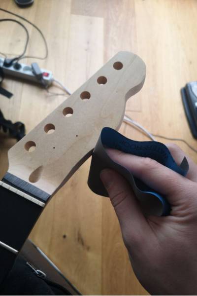 Dies ist jedoch wesentlich umständlicher und erfordert auch mehr Zeit. Danach geht es an die Perfektionierung der ausgeschnittenen Form. Am besten eignet sich ein Dremel für diese Arbeit. Mit verschiedensten Aufsätzen bringst du den Kopf in Form und sorgst bereits für die finale Optik. Danach muss der Kopf geschliffen werden. Alle Unebenheiten an der Kante gehören beseitigt. Ähnlich der Bearbeitung des Korpus schleifst du die vollständige Kopfplatte mit Schleifpapier, aufsteigend mit einem 400er bis zum 2000er.