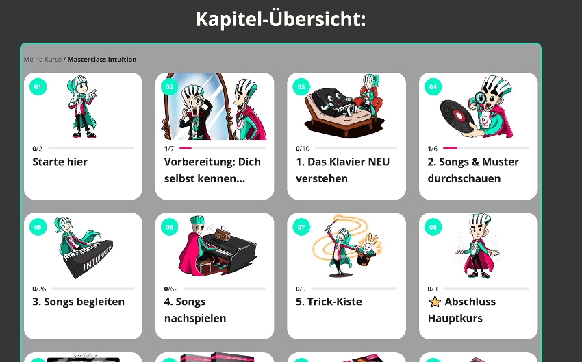 Mit einem Klick gelangt man in den jeweiligen Kurs, beim Herunterscrollen erscheint die Übersicht der einzelnen Kapitel. Die Farben der Plattform sind teilweise sehr präsent, vieles ist in pink oder türkis gehalten. Die liebevoll gestalteten Grafiken für die einzelnen Kapitel lockern die Lernatmosphäre auf, unterstreichen den Lerninhalt visuell und vermitteln mehr Spaß am Lernen.