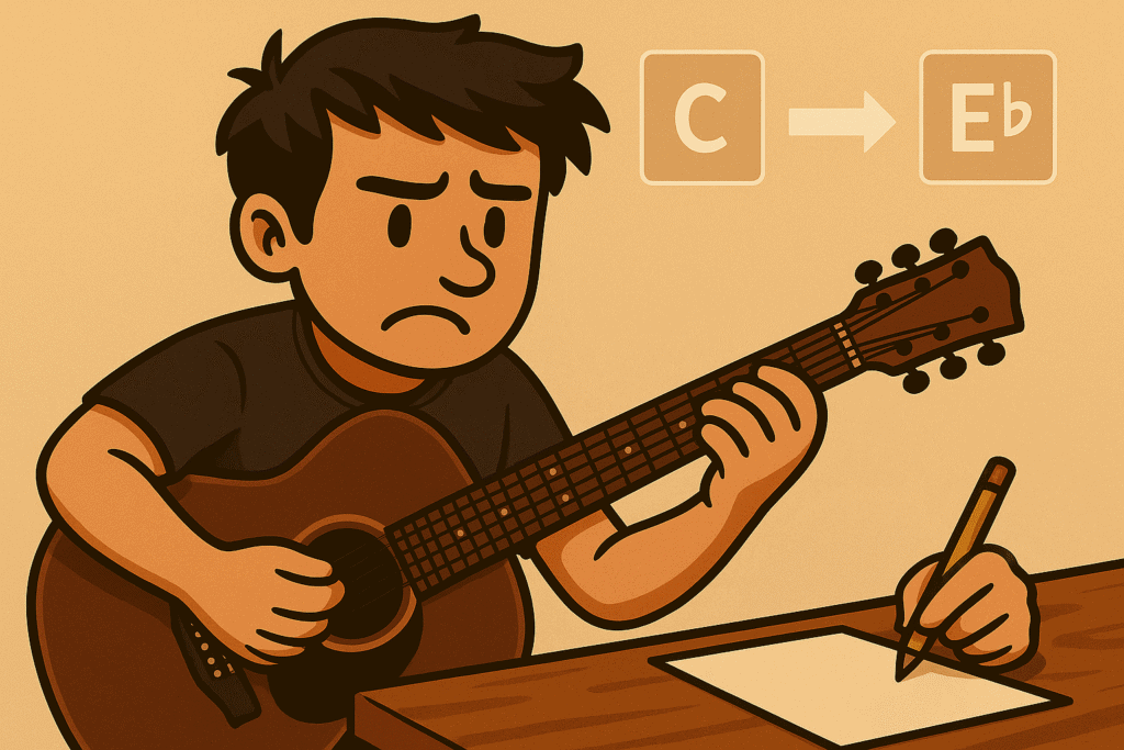Eine nützliche Übung ist die Verwendung einer Transponiertabelle, um die nötigen Akkordänderungen zu bestimmen. Singe oder spiele die neuen Akkorde laut, um sicherzustellen, dass sie korrekt klingen.