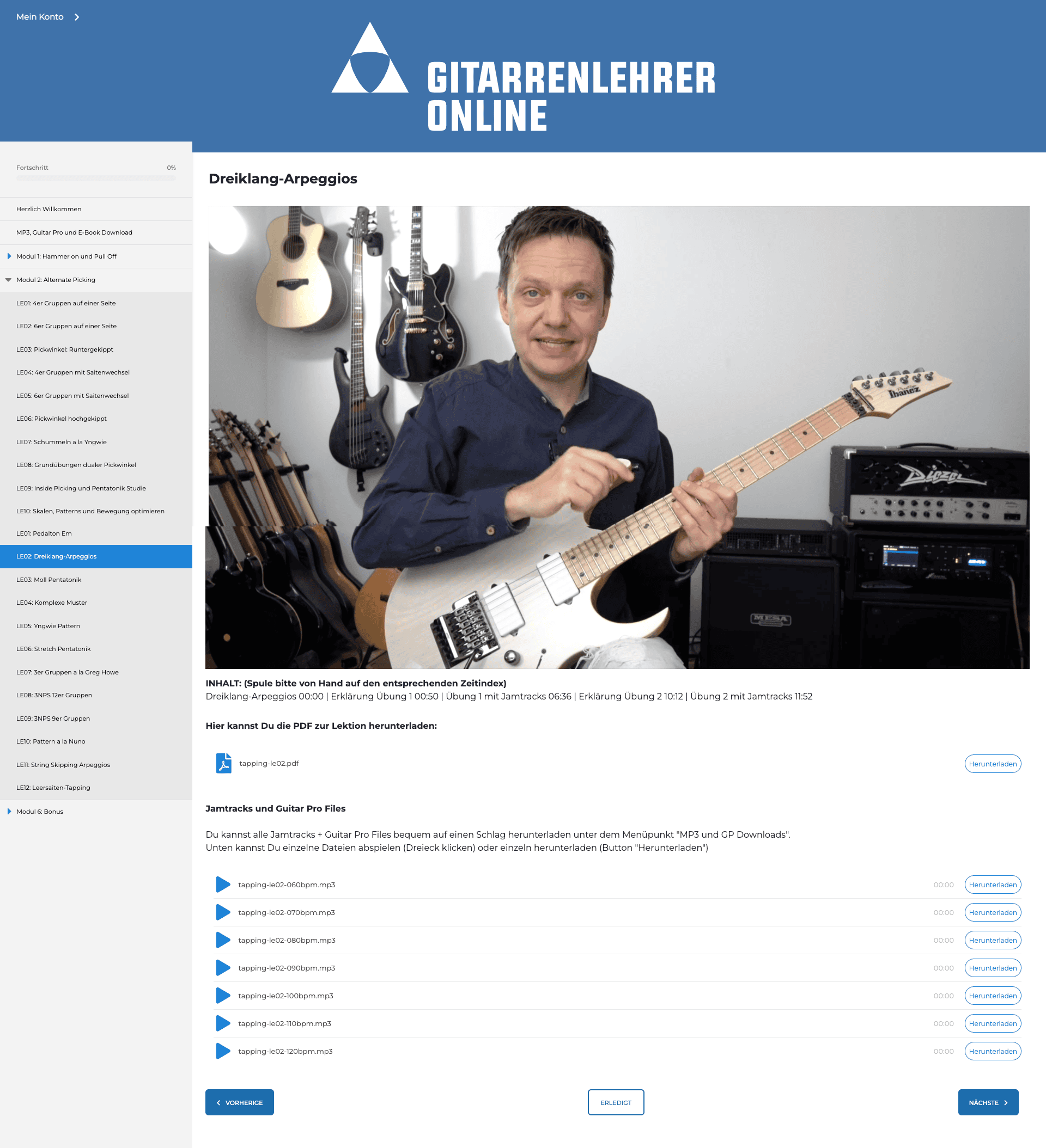 Im Technik-Pack werden sämtliche Themengebiete detailreich behandelt. Alternate Picking, Hammer-On, Pull-Off, Sweeping und Economy Picking werden hier umfassend behandelt. Es stehen dir 61 Lehreinheiten zur Verfügung, in Summe stundenlanges Videomaterial, welches um Playalongs und Downloadmaterial ergänzt wird.