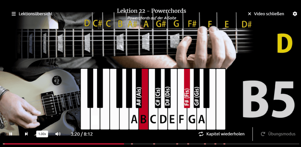 Daraufhin folgen Übungen, wobei du bestimmte Ausschnitte im Übungsmodus gesondert anwenden und jederzeit erneut abspielen kannst. Dem Powerchord wird also auch ein eigenes Kapitel gewidmet, auf welchem sämtliche nachfolgende Lektionen aufgebaut sind.