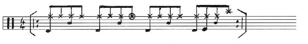 Es handelt sich um einen Standardbeat, der in der Schlagzeugwelt vielfach eingesetzt wird. Die Hi-Hat wird im 4/4-Takt gespielt, während auf die eins und die drei abwechselnd die Bass Drum und die Snare gespielt wird. Verziert wird das ganze noch mit dem Öffnen der Hi-Hat sowie dem Ansteuern des Crash Beckens. Hier die Hörprobe zur Notation: