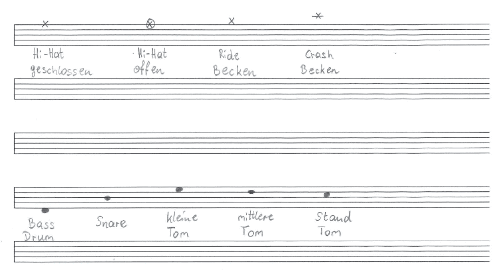 Nun kommt es zum Clou: bei den Drums hast du ja keine festen Töne der Tonleiter. Du spielst also nicht ein A, ein Fis oder ein E, sondern du schlägst auf die Hi-Hat, die Bassdrum oder die Snare. Diese verändern sich in ihrer Tonlage nicht. Für jedes Element des Schlagzeugs ist also ein bestimmtes Zeichen definiert, welches während des gesamten Stücks unverändert bleibt.