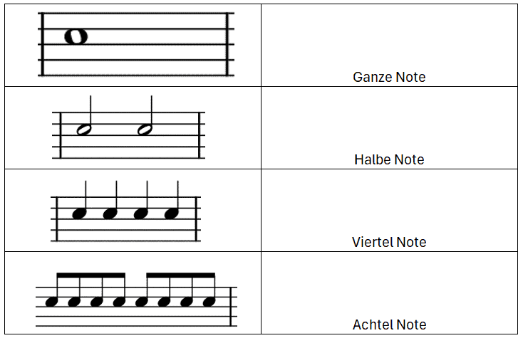 Da das Schlagzeug ein Rhythmusinstrument ist, ist eben der Rhythmus enorm wichtig. Als Schlagzeuger arbeitest du mit 4/4-, 3/4- oder 6/8-Takt, wie auch mit jedem anderen Instrument. Das Tempo der entsprechenden Noten ist ebenso ausschlaggebend. Es gibt ganze, halbe, viertel, achtel und sechzehntel Noten. Und so sehen sie auf dem Notenpapier aus:
