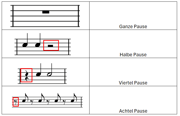 Außerdem können Pausen vermerkt werden, die definieren, wie lange die Drums aussetzen. Pausen werden ebenfalls in der für Klaviernoten üblichen Schreibweise notiert: