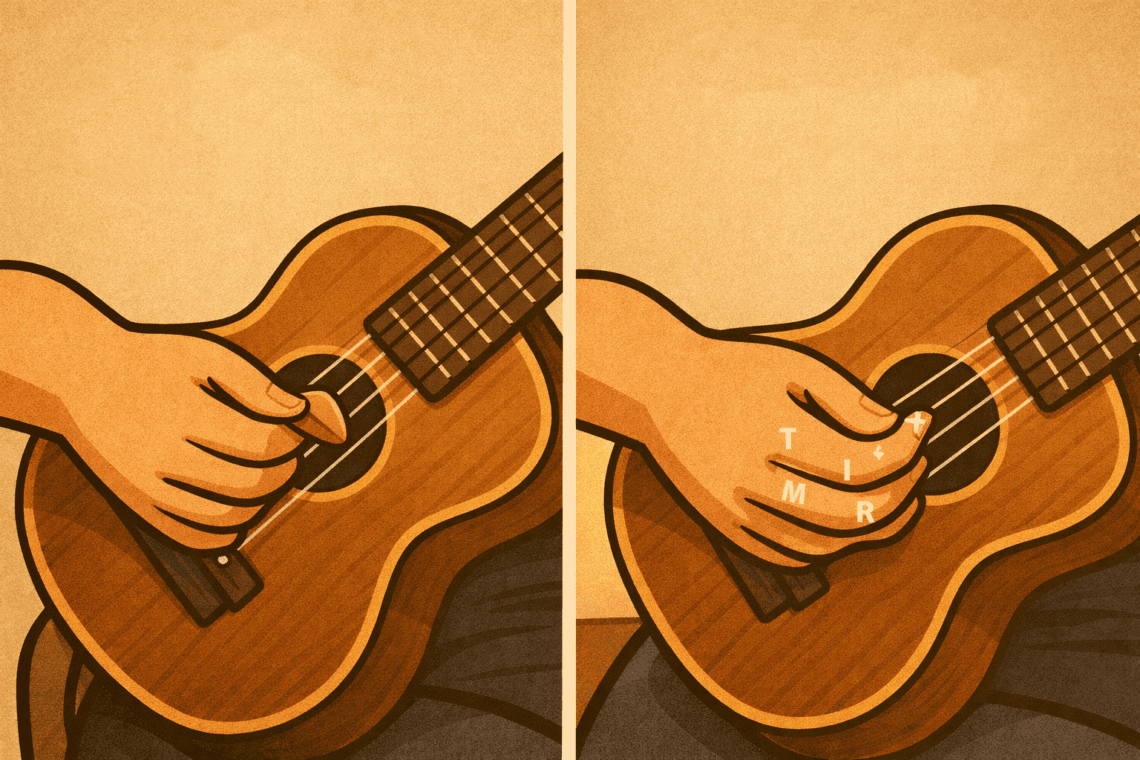 Lediglich der kleine Finger geht leer aus und kann als Stütze verwendet werden. Akkorde werden in der Regel mit den Fingern und ohne Plektron gespielt. Selbst wenn das Hybrid Picking bei der Ukulele äußerst selten zur Anwendung kommt, kannst du dich auch dieser Technik bedienen.
