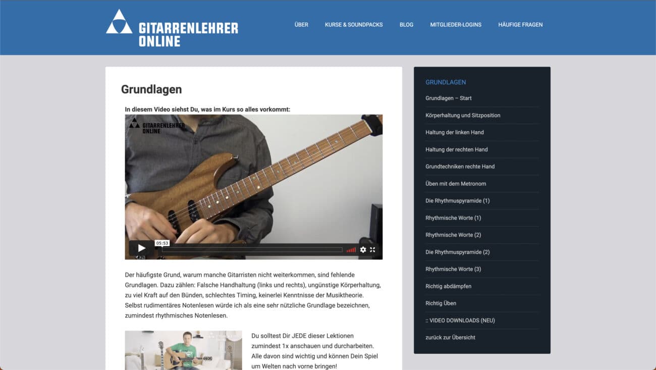 Die Kurse sind Video-Kurse, die von mir vorab aufgenommen wurden. Jede Lektion enthält ungefähr den Unterrichtsstoff einer „normalen“ 45-minütigen Gitarrenstunde. Allerdings kannst Du Dir hier so lange Zeit nehmen, wie Du für den Stoff brauchst. Vielleicht bist Du schneller, vielleicht langsamer – wer weiß? Du lernst in Deinem Tempo und musst Dich nicht stressen. Bei mir hast Du auch nach dem Buchen des Einzelkurses oder dem Abo direkt Zugriff auf alle Lektionen, es wird nichts zurückgehalten oder eingeschränkt. Einzelkurskäufer können die Lektionen sogar herunterladen und lokal speichern. Natürlich gibt es auch TABs/Noten als PDF.