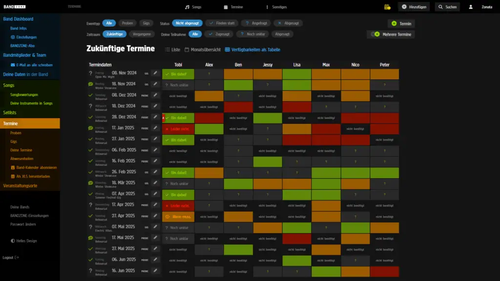 Der eigentlich Knoten- bzw. Treffpunkt ist dann der Kalender. Aufgeteilt ist der zunächst in die Reiter „Proben“ und „Gigs“. Die Termine lassen sich zuweisen, ebenso können Abwesenheiten festgelegt werden, also Tage, an denen einzelne Bandmitglieder nicht verfügbar sind, und zu denen eben keine Auftritte angenommen oder Proben gemacht werden können. Für den XLS-Download muss das Kalender-Abo nicht separat freigeschaltet werden.