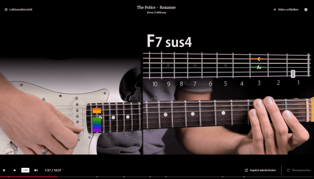 music2me ist eine vollwertige Musik-Plattform, die Onlinekurse für das Gitarre Lernen anbietet. Im Kurs „Fortgeschritten 2: Rock Songs & Riffs“ werden Musikstücke im mittleren Schwierigkeitsgrad umfassend beleuchtet. Unter anderem wird in einem eigenen Kapitel „Roxanne“ von The Police behandelt.
